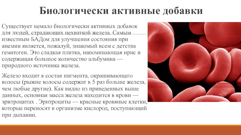 железа. Самым известным БАДом для улучшения состояния при анемии является, пожалуй, знакомый всем с детства гематоген. Это сладкая плитка, напоминающая ирис и содержащая большое количество альбумина — природного источника железа.