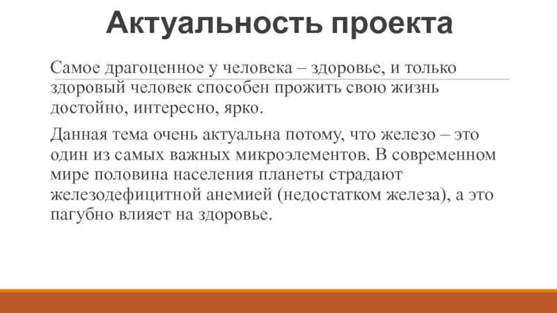 Данная тема очень актуальна потому, что железо – это один из самых важных микроэлементов. В современном мире половина населения планеты страдают железодефицитной анемией (недостатком железа), а это пагубно влияет на здоровье.