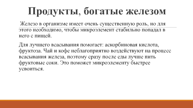 Для лучшего всасывания помогает: аскорбиновая кислота, фруктоза. Чай и кофе неблагоприятно воздействуют на процесс всасывания железа, поэтому сразу после еды лучше пить фруктовые соки. Это поможет микроэлементу быстрее усвоиться.