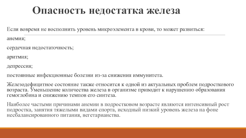 Наиболее частыми причинами анемии в подростковом возрасте являются интенсивный рост подростка, занятия тяжелыми видами спорта, исходный низкий уровень железа на фоне несбалансированного питания, вегетарианства.