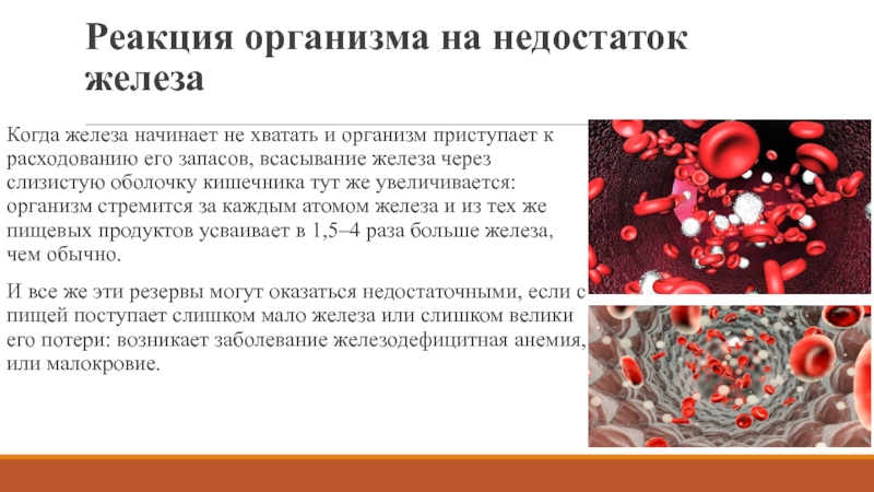 приступает к расходованию его запасов, всасывание железа через слизистую оболочку кишечника тут же увеличивается: организм стремится за каждым атомом железа и из тех же пищевых продуктов усваивает в 1,5–4 раза больше железа, чем обычно.