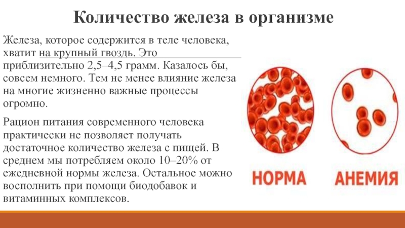 крупный гвоздь. Это приблизительно 2,5–4,5 грамм. Казалось бы, совсем немного. Тем не менее влияние железа на многие жизненно важные процессы огромно.