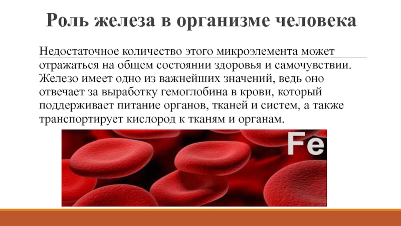 общем состоянии здоровья и самочувствии. Железо имеет одно из важнейших значений, ведь оно отвечает за выработку гемоглобина в крови, который поддерживает питание органов, тканей и систем, а также транспортирует кислород к тканям и органам.