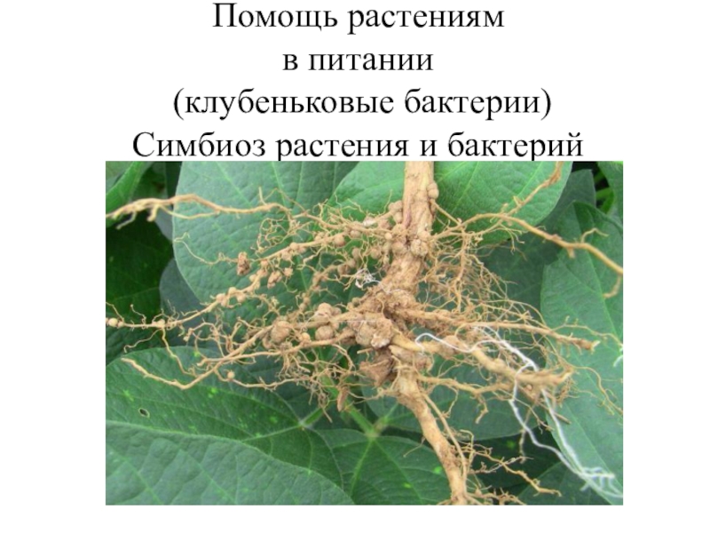 Слайд 16Помощь растениям в питании (клубеньковые бактерии) Симбиоз растения и бактерий