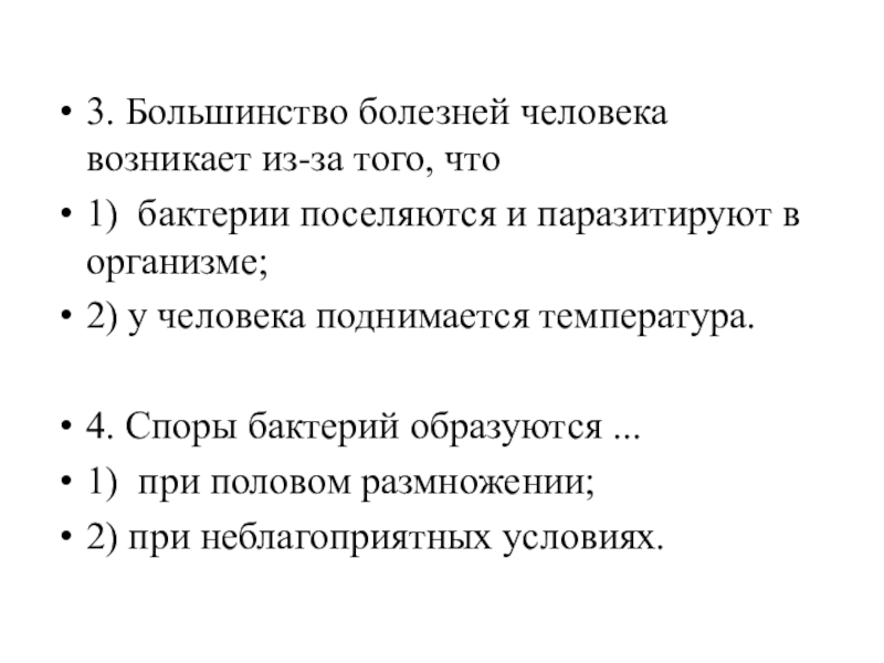 3. Большинство болезней человека возникает из-за того, что1)  бактерии поселяются и паразитируют в организме;2) у человека поднимается