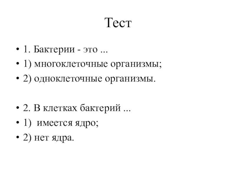 Тест1. Бактерии - это ...1) многоклеточные организмы;2) одноклеточные организмы.2. В клетках бактерий ...1)  имеется ядро;2) нет ядра.