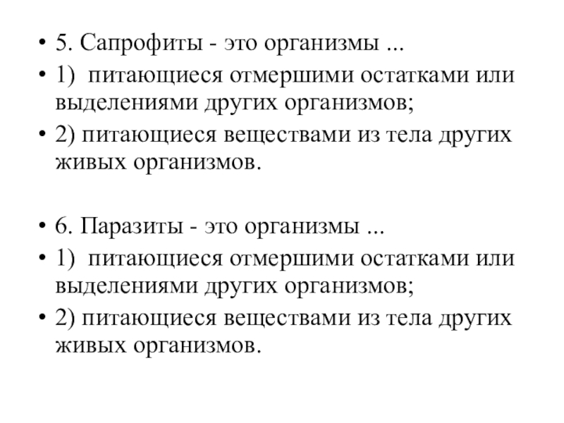 5. Сапрофиты - это организмы ...1)  питающиеся отмершими остатками или выделениями других организмов;2) питающиеся веществами из тела