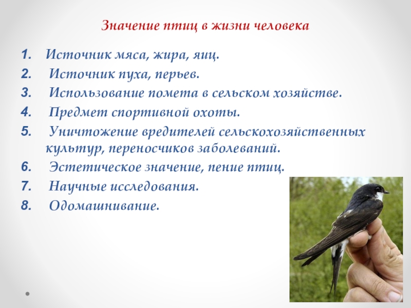 Значение птиц в жизни человекаИсточник мяса, жира, яиц. Источник пуха, перьев. Использование помета в сельском хозяйстве. Предмет