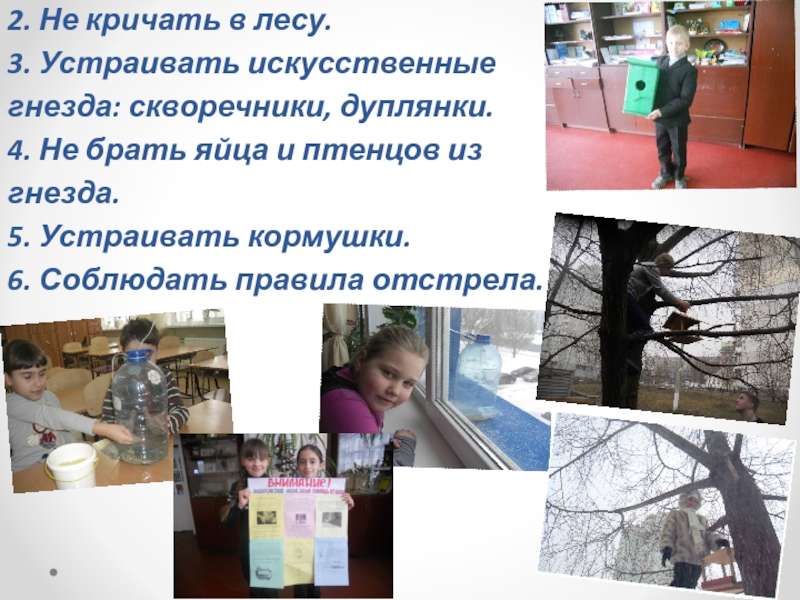 скворечники, дуплянки. 4. Не брать яйца и птенцов из гнезда. 5. Устраивать кормушки. 6. Соблюдать правила отстрела.
