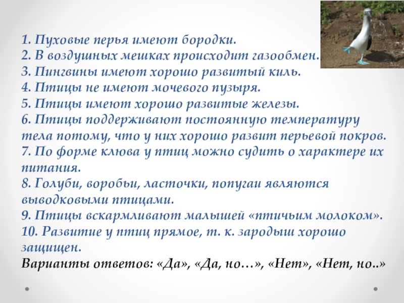 имеют хорошо развитый киль. 4. Птицы не имеют мочевого пузыря. 5. Птицы имеют хорошо развитые железы. 6. Птицы поддерживают постоянную температуру тела потому, что у них хорошо развит перьевой покров. 7. По форме клюва у птиц можно судить о характере их питания. 8. Голуби, воробьи, ласточки, попугаи являются выводковыми птицами. 9. Птицы вскармливают малышей «птичьим молоком». 10. Развитие у птиц прямое, т. к. зародыш хорошо защищен. Варианты ответов: «Да», «Да, но…», «Нет», «Нет, но..»