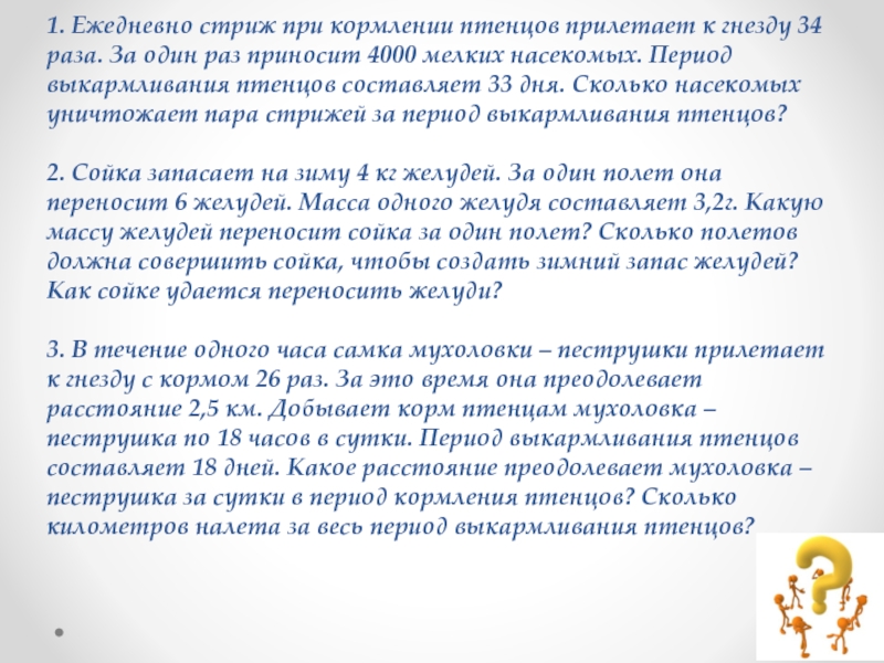 За один раз приносит 4000 мелких насекомых. Период выкармливания птенцов составляет 33 дня. Сколько насекомых уничтожает пара стрижей за период выкармливания птенцов? 2. Сойка запасает на зиму 4 кг желудей. За один полет она переносит 6 желудей. Масса одного желудя составляет 3,2г. Какую массу желудей переносит сойка за один полет? Сколько полетов должна совершить сойка, чтобы создать зимний запас желудей? Как сойке удается переносить желуди? 3. В течение одного часа самка мухоловки – пеструшки прилетает к гнезду с кормом 26 раз. За это время она преодолевает расстояние 2,5 км. Добывает корм птенцам мухоловка – пеструшка по 18 часов в сутки. Период выкармливания птенцов составляет 18 дней. Какое расстояние преодолевает мухоловка – пеструшка за сутки в период кормления птенцов? Сколько километров налета за весь период выкармливания птенцов?