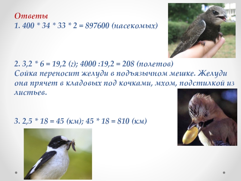 3,2 * 6 = 19,2 (г); 4000 :19,2 = 208 (полетов) Сойка переносит желуди в подъязычном мешке. Желуди она прячет в кладовых под кочками, мхом, подстилкой из листьев. 3. 2,5 * 18 = 45 (км); 45 * 18 = 810 (км)