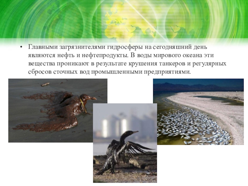 Главными загрязнителями гидросферы на сегодняшний день являются нефть и нефтепродукты. В