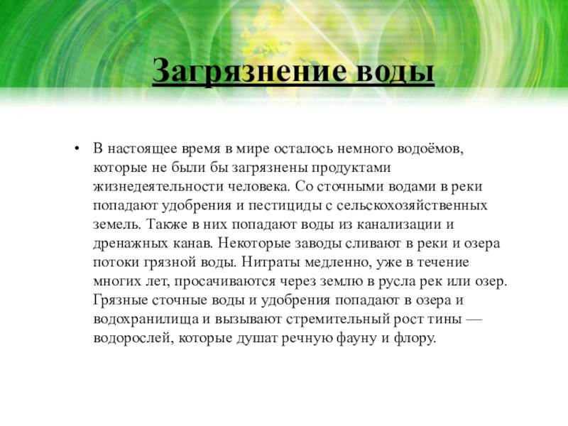 были бы загрязнены продуктами жизнедеятельности человека. Со сточными водами в реки попадают удобрения и пестициды с сельскохозяйственных земель. Также в них попадают воды из канализации и дренажных канав. Некоторые заводы сливают в реки и озера потоки грязной воды. Нитраты медленно, уже в течение многих лет, просачиваются через землю в русла рек или озер. Грязные сточные воды и удобрения попадают в озера и водохранилища и вызывают стремительный рост тины — водорослей, которые душат речную фауну и флору.
