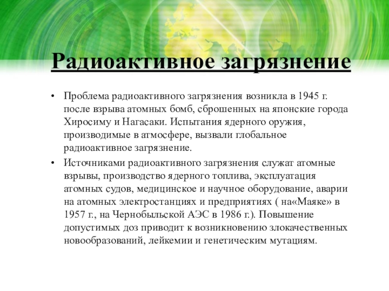 Источниками радиоактивного загрязнения служат атомные взрывы, производство ядерного топлива, эксплуатация атомных судов, медицинское и научное оборудование, аварии на атомных электростанциях и предприятиях ( на«Маяке» в 1957 г., на Чернобыльской АЭС в 1986 г.). Повышение допустимых доз приводит к возникновению злокачественных новообразований, лейкемии и генетическим мутациям.