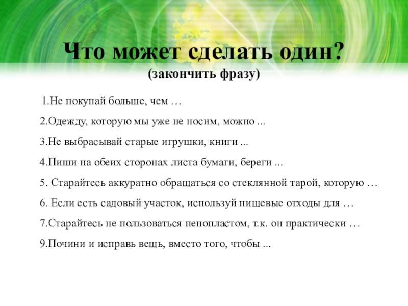 7.Старайтесь не пользоваться пенопластом, т.к. он практически … 9.Почини и исправь вещь, вместо того, чтобы ...