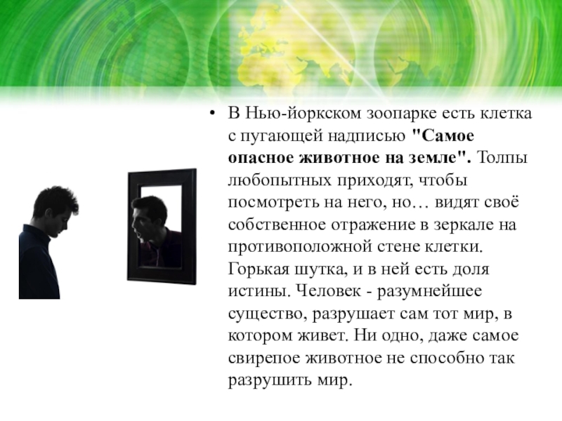 на земле". Толпы любопытных приходят, чтобы посмотреть на него, но… видят своё собственное отражение в зеркале на противоположной стене клетки. Горькая шутка, и в ней есть доля истины. Человек - разумнейшее существо, разрушает сам тот мир, в котором живет. Ни одно, даже самое свирепое животное не способно так разрушить мир.