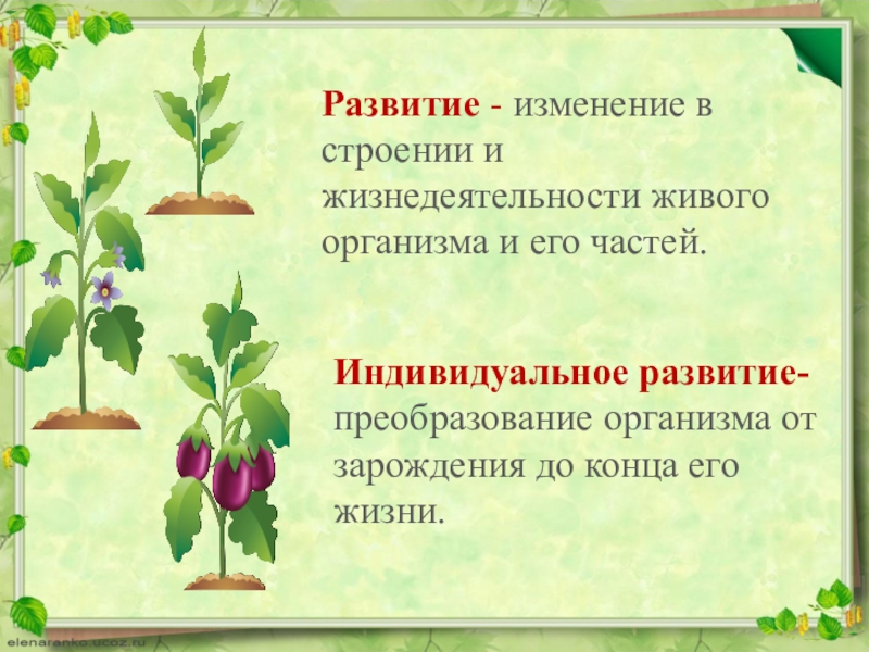 Индивидуальное развитие- преобразование организма от зарождения до конца его жизни.