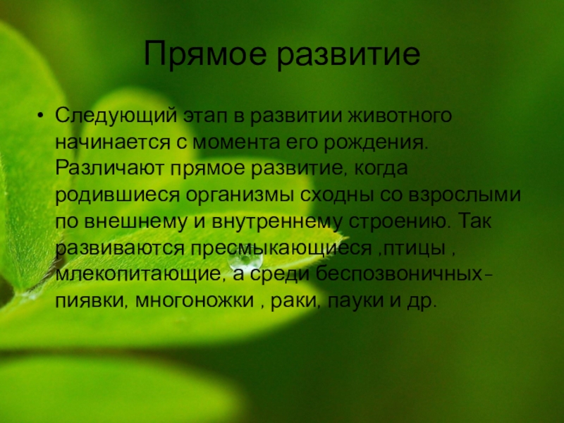 Различают прямое развитие, когда родившиеся организмы сходны со взрослыми по внешнему и внутреннему строению. Так развиваются пресмыкающиеся ,птицы ,млекопитающие, а среди беспозвоничных- пиявки, многоножки , раки, пауки и др.