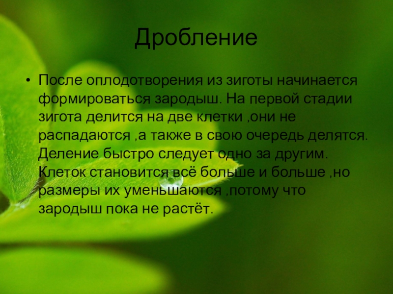 делится на две клетки ,они не распадаются ,а также в свою очередь делятся. Деление быстро следует одно за другим. Клеток становится всё больше и больше ,но размеры их уменьшаются ,потому что зародыш пока не растёт.