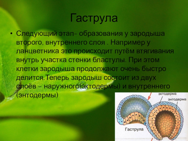 ланцветника это происходит путём втягивания внутрь участка стенки бластулы. При этом клетки зародыша продолжают очень быстро делится.Теперь зародыш состоит из двух слоёв – наружного(эктодермы) и внутреннего(энтодермы)