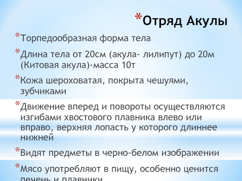 Отряд АкулыТорпедообразная форма телаДлина тела от 20см (акула- лилипут) до 20м (Китовая акула)-масса 10тКожа шероховатая, покрыта чешуями,