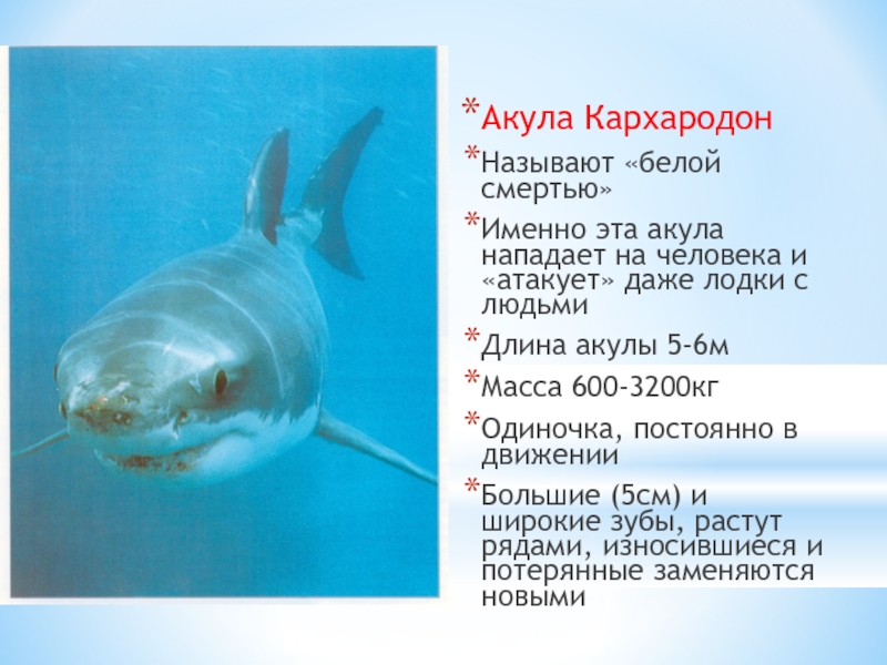 Акула КархародонНазывают «белой смертью»Именно эта акула нападает на человека и «атакует» даже лодки с людьмиДлина акулы 5-6мМасса