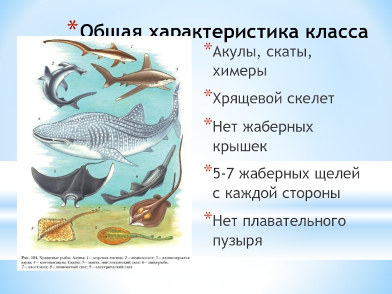 Общая характеристика классаАкулы, скаты, химерыХрящевой скелетНет жаберных крышек5-7 жаберных щелей с каждой стороныНет плавательного пузыря