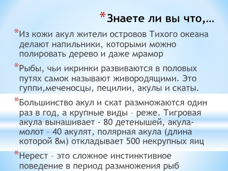 Знаете ли вы что,…Из кожи акул жители островов Тихого океана делают напильники, которыми можно полировать дерево и