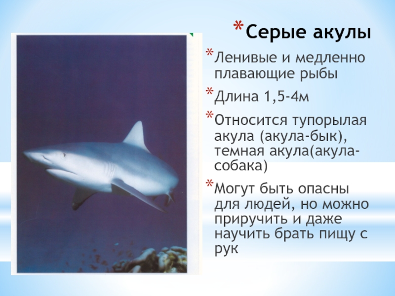Серые акулыЛенивые и медленно плавающие рыбыДлина 1,5-4мОтносится тупорылая акула (акула-бык), темная акула(акула-собака)Могут быть опасны для людей, но