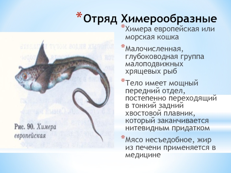 Отряд ХимерообразныеХимера европейская или морская кошкаМалочисленная, глубоководная группа малоподвижных хрящевых рыбТело имеет мощный передний отдел, постепенно переходящий