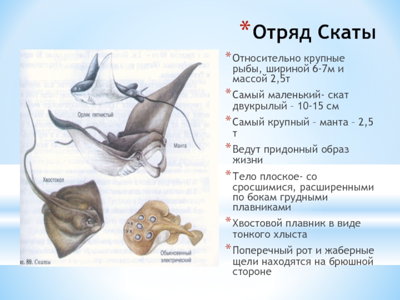 Отряд СкатыОтносительно крупные рыбы, шириной 6-7м и массой 2,5тСамый маленький- скат двукрылый – 10-15 смСамый крупный –