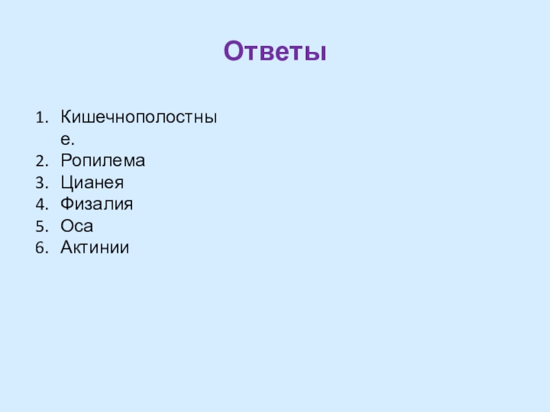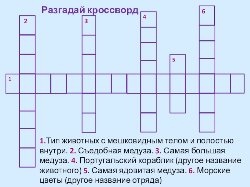 медуза. 3. Самая большая медуза. 4. Португальский кораблик (другое название животного) 5. Самая ядовитая медуза. 6. Морские цветы (другое название отряда)