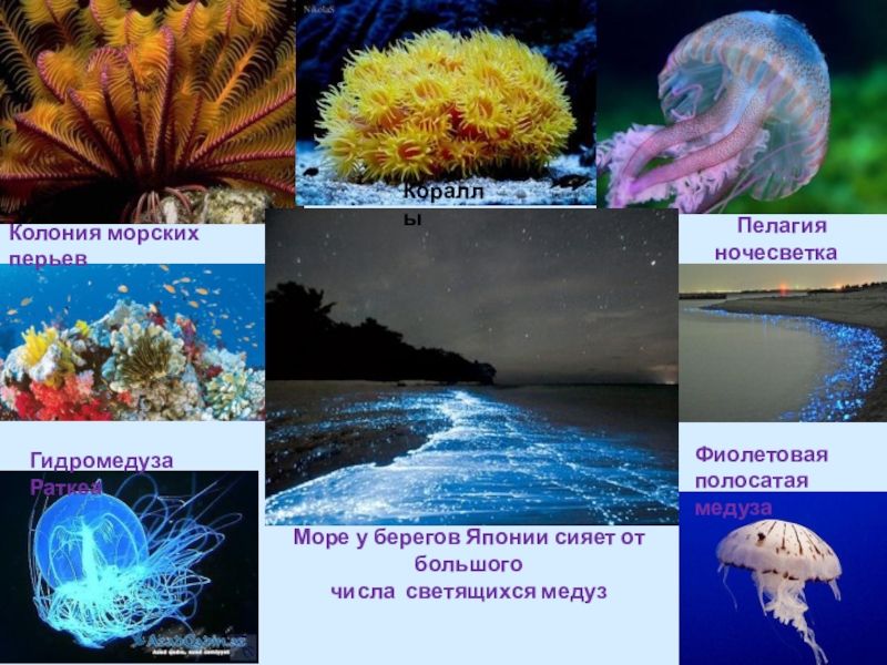 маленькая медуза раткеа (Ratkea), медуза экворея (Aequorea) и сцифоидная медуза пелагия ночесветка(Pelagia noctilica) Пелагия в диаметре 65 мм., щупальца до 500 мм., обитает у побережья Австралии, вызывает ожоги у человека. Когда таких медуз много у поверхности волны кажутся пламенеющими. Из донных светятся некоторые гидроиды и многие морские перья. Морские перья, обитают на глубине от 1 до 6 тысяч метров, есть экземпляры до 2,5 м, насчитывается около 300 видов морских перьев (Pennatularia). Каждый полип –множество восьми щупальцевых особей сидящих на одном общем толстом стебле. Светятся за счет особой слизи их покрывающей, эта слизь светится даже высушенная. Свечение кишечнополостных может быть синим, голубоватым, зеленым.