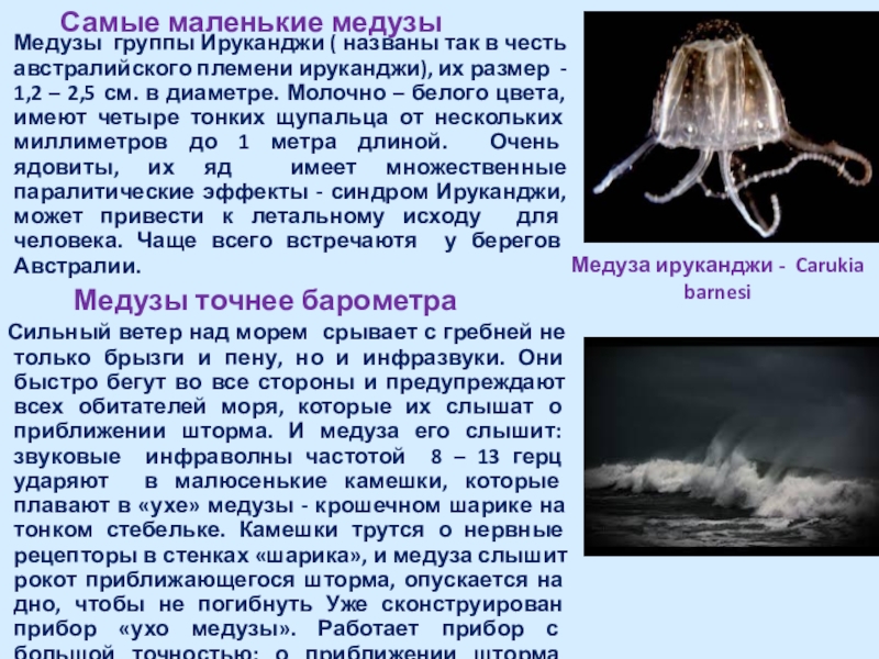 Сильный ветер над морем срывает с гребней не только брызги и пену, но и инфразвуки. Они быстро бегут во все стороны и предупреждают всех обитателей моря, которые их слышат о приближении шторма. И медуза его слышит: звуковые инфраволны частотой 8 – 13 герц ударяют в малюсенькие камешки, которые плавают в «ухе» медузы - крошечном шарике на тонком стебельке. Камешки трутся о нервные рецепторы в стенках «шарика», и медуза слышит рокот приближающегося шторма, опускается на дно, чтобы не погибнуть Уже сконструирован прибор «ухо медузы». Работает прибор с большой точностью: о приближении шторма предупреждает за 15 часов (1965 год)