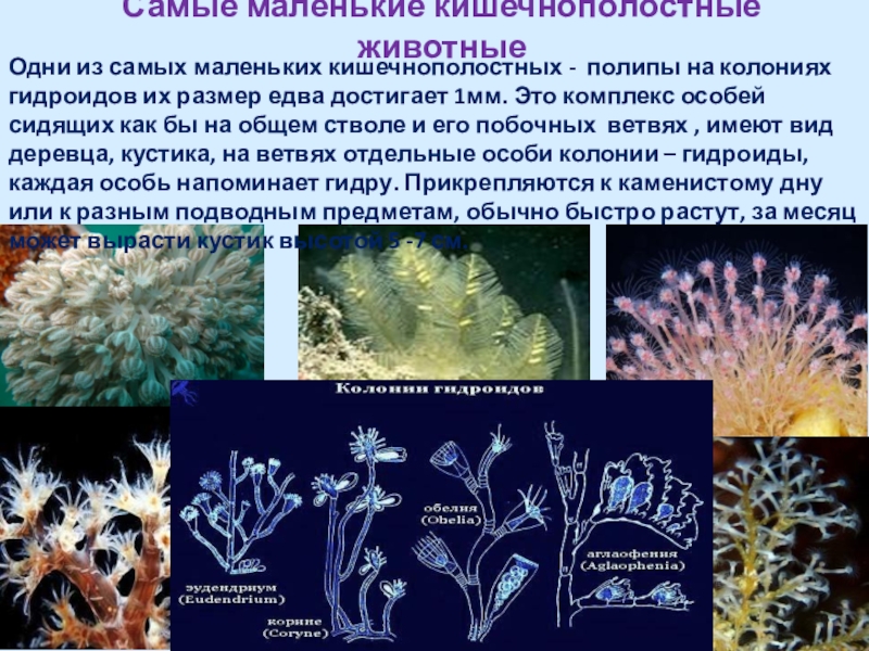 колониях гидроидов их размер едва достигает 1мм. Это комплекс особей сидящих как бы на общем стволе и его побочных ветвях , имеют вид деревца, кустика, на ветвях отдельные особи колонии – гидроиды, каждая особь напоминает гидру. Прикрепляются к каменистому дну или к разным подводным предметам, обычно быстро растут, за месяц может вырасти кустик высотой 5 -7 см.