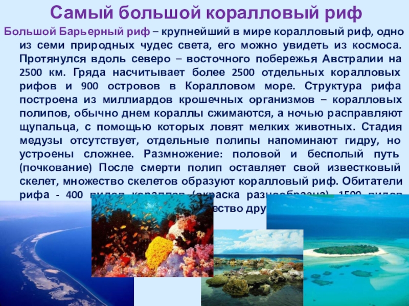 риф, одно из семи природных чудес света, его можно увидеть из космоса. Протянулся вдоль северо – восточного побережья Австралии на 2500 км. Гряда насчитывает более 2500 отдельных коралловых рифов и 900 островов в Коралловом море. Структура рифа построена из миллиардов крошечных организмов – коралловых полипов, обычно днем кораллы сжимаются, а ночью расправляют щупальца, с помощью которых ловят мелких животных. Стадия медузы отсутствует, отдельные полипы напоминают гидру, но устроены сложнее. Размножение: половой и бесполый путь (почкование) После смерти полип оставляет свой известковый скелет, множество скелетов образуют коралловый риф. Обитатели рифа - 400 видов кораллов (окраска разнообразна), 1500 видов тропических рыб, огромное количество других организмов.