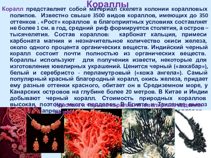 видов кораллов, имеющих до 350 оттенков . «Рост» кораллов в благоприятных условиях составляет не более 1 см. в год, средний риф формируется столетия, а остров – тысячелетия. Состав кораллов: карбонат кальция, примеси карбоната магния и незначительное количество окиси железа, около одного процента органических веществ. Индийский черный коралл состоит почти полностью из органических веществ. Кораллы используют для получения извести, некоторые для изготовления ювелирных украшений. Ценится черный («аккабар»), белый и серебристо - перламутровый («кожа ангела»). Самый популярный красный благородный коралл, окись железа, придает ему разные оттенки красного, обитает он в Средиземном море, у Канарских островов на глубине более 20 метров. В Китае и Индии добывают черный коралл. Стоимость природных кораллов высокая, поэтому много подделок. В Египте и Таиланде вывоз кораллов запрещен законом, в Египте за это штраф 1000 долларов.