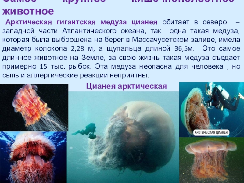 – западной части Атлантического океана, так одна такая медуза, которая была выброшена на берег в Массачусетском заливе, имела диаметр колокола 2,28 м, а щупальца длиной 36,5м. Это самое длинное животное на Земле, за свою жизнь такая медуза съедает примерно 15 тыс. рыбок. Эта медуза неопасна для человека , но сыпь и аллергические реакции неприятны.