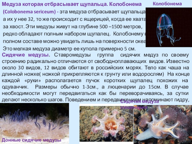Сидячие медузы. Ставромедузы группа сидячих медуз по своему строению радикально отличаются от свободноплавающих видов. Известно около 30 видов, 12 видов обитают в российских морях. Тело как чаша на длинной ножке( ножкой прикрепляются к грунту или водорослям) На конце каждой «руки» располагается пучок коротких щупалец похожих на одуванчик. Размеры обычно 1-3см., а люценарии до 15см. В случае необходимости могут передвигаться как бы переворачиваясь, за сутки делают несколько шагов. Поведением и передвижением напоминают гидру, хищники.