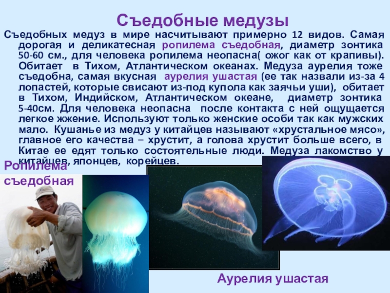 и деликатесная ропилема съедобная, диаметр зонтика 50-60 см., для человека ропилема неопасна( ожог как от крапивы). Обитает в Тихом, Атлантическом океанах. Медуза аурелия тоже съедобна, самая вкусная аурелия ушастая (ее так назвали из-за 4 лопастей, которые свисают из-под купола как заячьи уши), обитает в Тихом, Индийском, Атлантическом океане, диаметр зонтика 5-40см. Для человека неопасна после контакта с ней ощущается легкое жжение. Используют только женские особи так как мужских мало. Кушанье из медуз у китайцев называют «хрустальное мясо», главное его качества – хрустит, а голова хрустит больше всего, в Китае ее едят только состоятельные люди. Медуза лакомство у китайцев, японцев, корейцев.