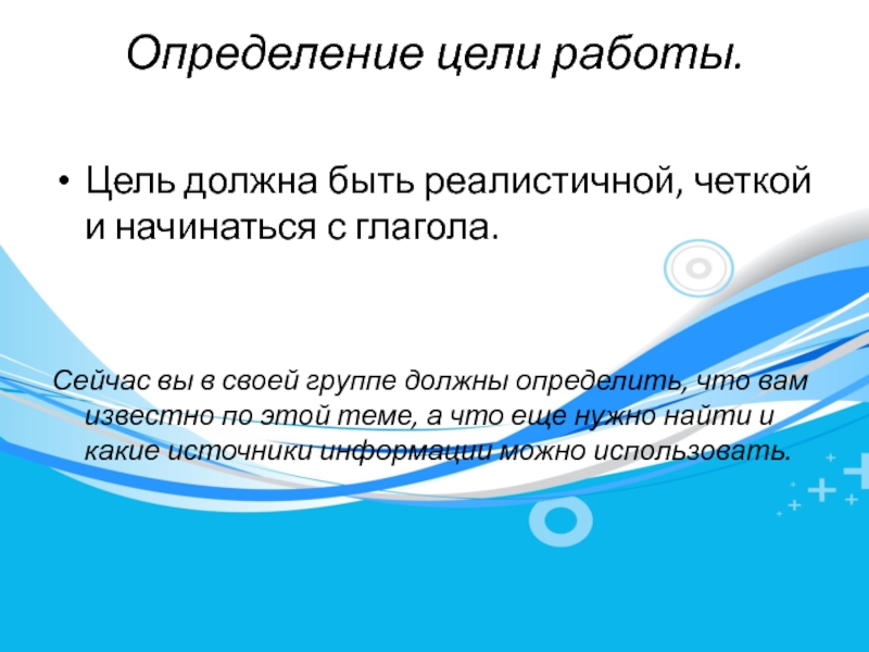 Определение цели работы. Цель должна быть реалистичной, четкой и начинаться с глагола.Сейчас вы в своей группе должны
