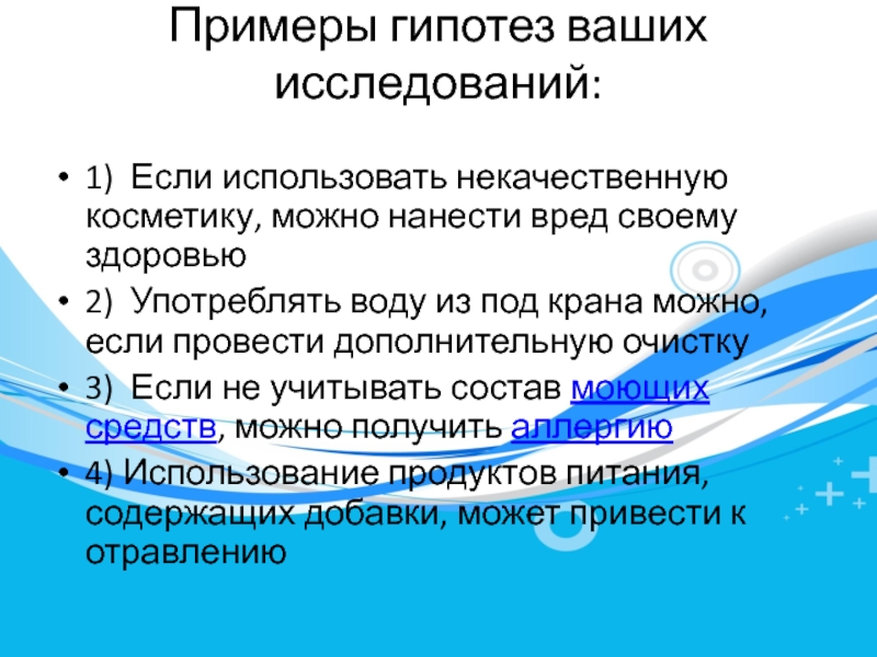 Примеры гипотез ваших исследований: 1)  Если использовать некачественную косметику, можно нанести вред своему здоровью2)  Употреблять воду из