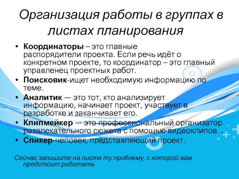 Организация работы в группах в листах планирования	Координаторы – это главные распорядители проекта. Если речь идёт о конкретном проекте, то координатор –