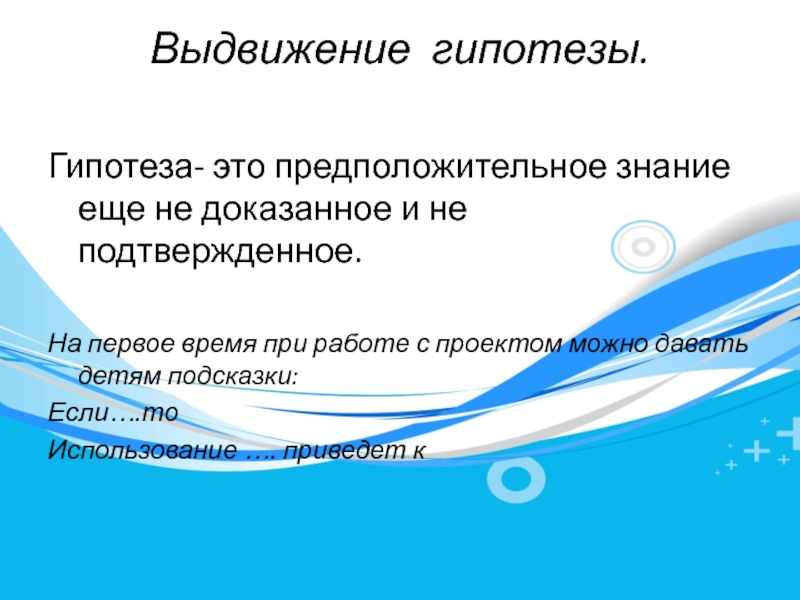 Выдвижение гипотезы. Гипотеза- это предположительное знание еще не доказанное и не подтвержденное.На первое время при работе с