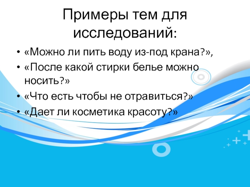 Примеры тем для исследований:«Можно ли пить воду из-под крана?»,«После какой стирки белье можно носить?»«Что есть чтобы не