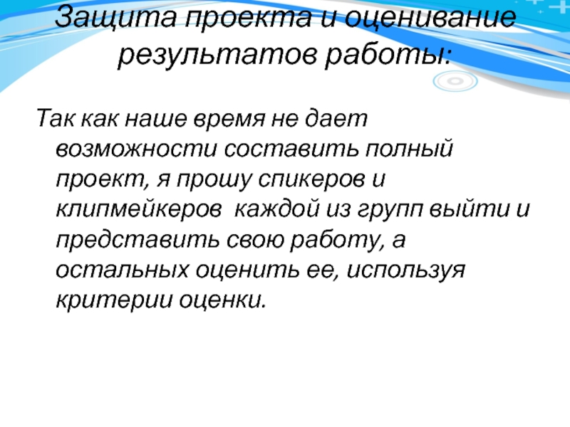 возможности составить полный проект, я прошу спикеров и клипмейкеров каждой из групп выйти и представить свою работу, а остальных оценить ее, используя критерии оценки.