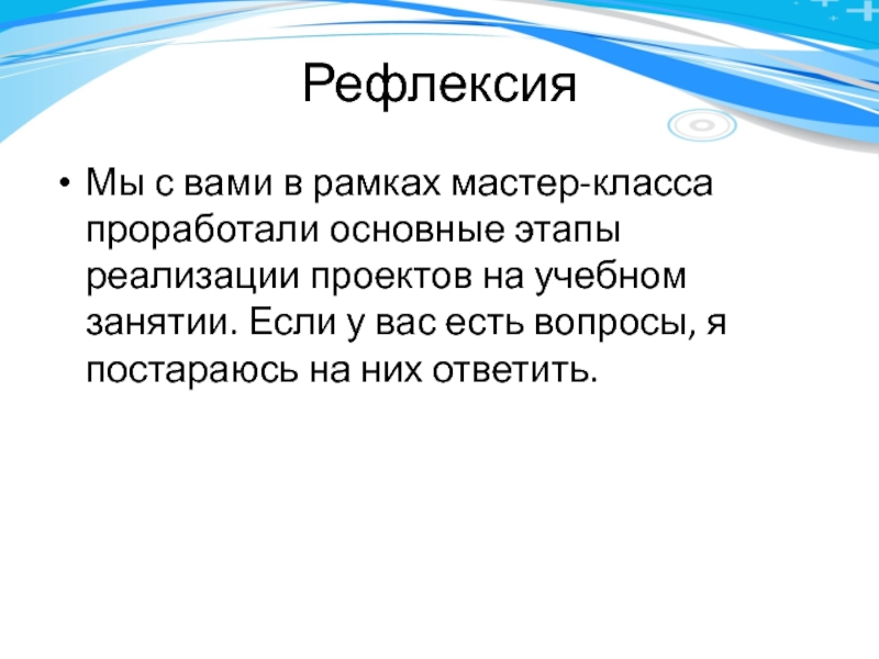 РефлексияМы с вами в рамках мастер-класса проработали основные этапы реализации проектов на учебном занятии. Если у вас
