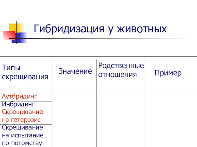Гибридизация у животныхТипы скрещиванияРодственные отношенияЗначениеПримерАутбридингИнбридингСкрещиваниена гетерозисСкрещивание на испытание по потомству