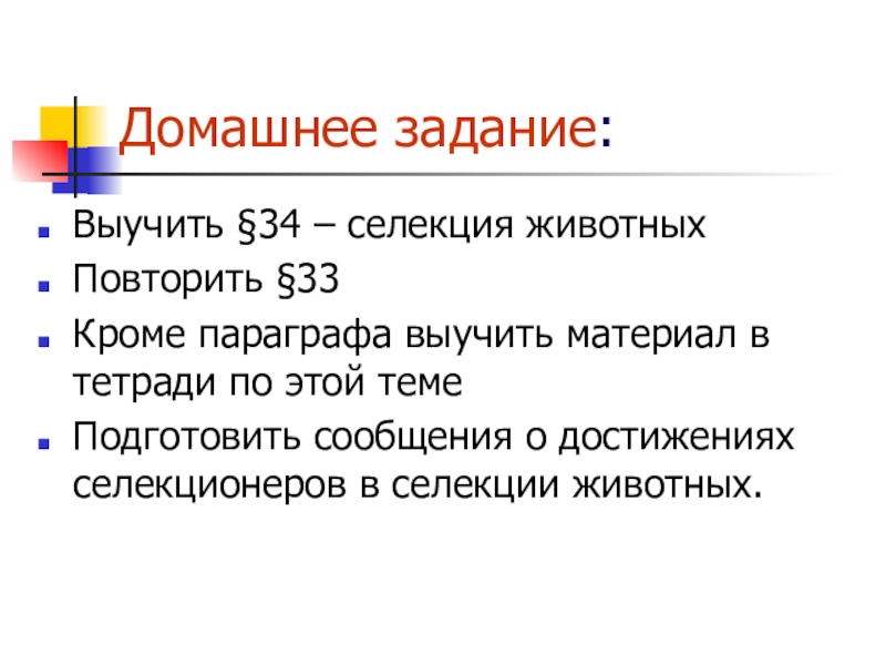 Домашнее задание:Выучить §34 – селекция животныхПовторить §33Кроме параграфа выучить материал в тетради по этой темеПодготовить сообщения о